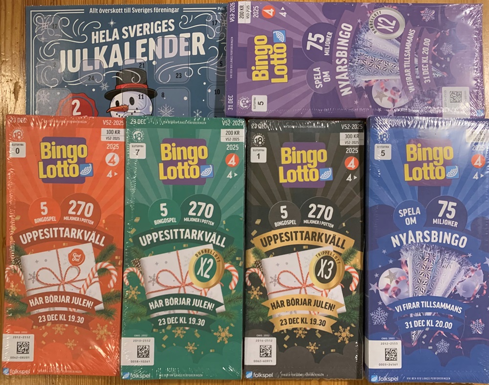 Det är dags att förgylla lillejulafton med bingolotter. Vi har nu fått lotterna och ni kan börja sälja. De finns att hämta hos Mats eller på kansliet. Priserna är 100, 200 och 300 kronor och det finns lotter både till jul och nyår att tillgå. Även julkalendern för 100 kronor och idrottsrabatthäfte för 130 kr finns att sälja.